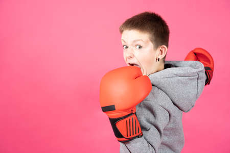 Angry boy wearing boxing gloves threatening and looking at camera isolated on pink background. bullying defense concept