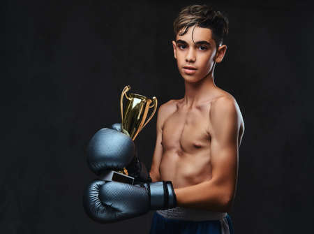 Young shirtless boxer champion wearing gloves holds a winners cup. Isolated on the dark background.