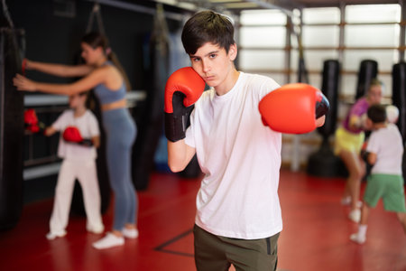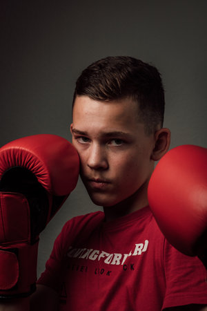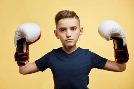 Boy wearing boxing gloves during boxing classes. High quality photo