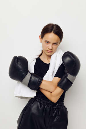 young woman with towel boxing black gloves posing sports Lifestyle unaltered