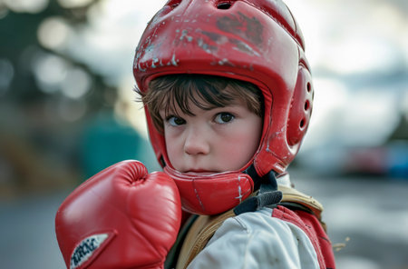 young boy wearing a red boxing helmet and gloves. He is looking at the camera with a serious expression