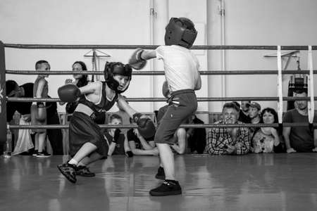 Odessa, Ukraine, May 15, 2021: Boxing tournaments among children. Children's boxing, children's sports. Children struggle with these adult emotions. Popularization of sports and a healthy lifestyle