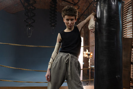 Boxing with a punching bag, sports achievements concept, female wrestler in a boxing ring, cinematic image, mood, motivating stories
