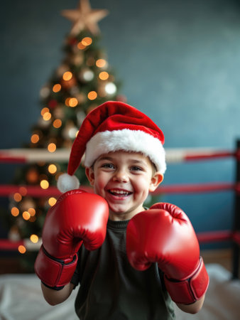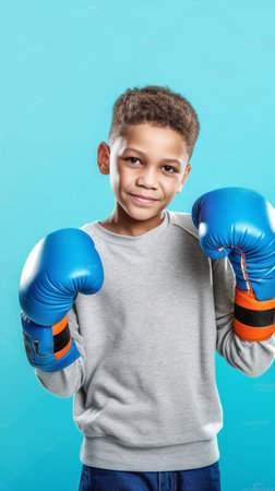happy kid boxer in boxing gloves during sport training, copy space, sport