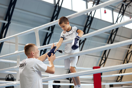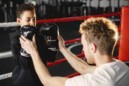 Help, support. Junior athlete, male boxer training with personal coach at sports gym, indoors. Concept of studying, challenges, sport, hobbies, competition