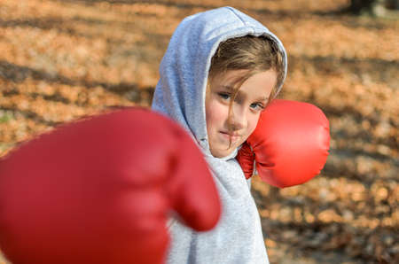 Little adorable girl child in a tracksuit, with a hood on his head, in red boxing gloves, boxing on the street in the autumn forest, young boxer