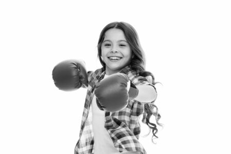 Kid strong and independent girl. Feel strong and independent. Girls power concept. Upbringing confidence and strong character. Female rights and liberties. Girl boxing gloves ready to fight