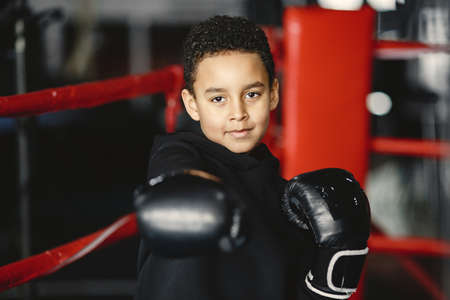 African American kid boxer in gym space. Boy in boxing gloves practicing boxing punches. Concept of physical education, youth sports, childhood activity, active lifestyle, energetic pastime