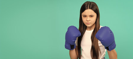 punching. determined successful kid boxer. fight for success. confident child ready for competition. Horizontal poster of isolated child face, banner header, copy space.