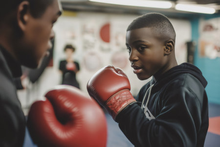 Young African American athlete practicing boxing punches with his trainer in a gym, showcasing dedication and skill in every movement