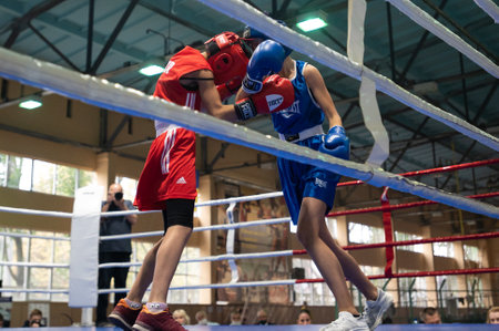 KHARKIV, UKRAINE - OCTOBER 2, 2020: Girls boxers in the fight on the ring during the Ukraine Women Champion Cup 2020