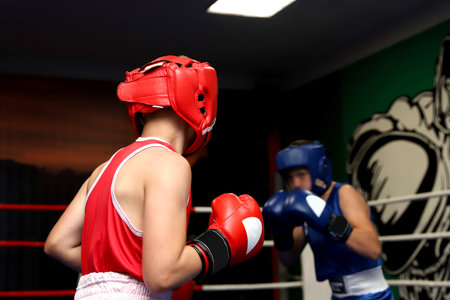 Two boys in protective equipment have sparring and fighting on the boxing ring.