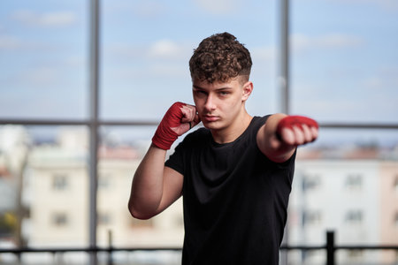 Young kickboxer with hands wrapped doing shadow boxing in the gym
