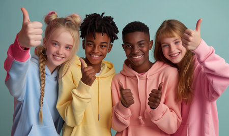 Group of interracial teenage schoolboys and girls in colorful sweatshirts showing thumbs up on blue background