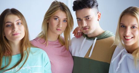 Portrait of group of friends standing in a row and looking at camera