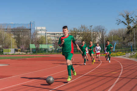 Odessa, Ukraine - April 7, 2021: Local children's football teams U-14 play on artificial grass of stadium. Football on field with artificial grass for soccer games. Children are playing football