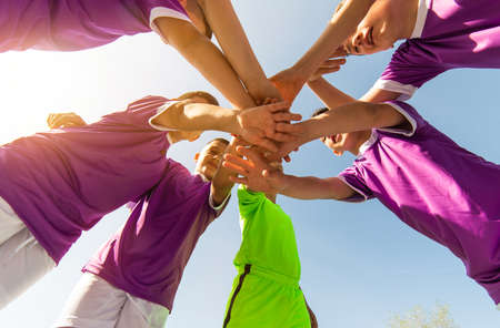 Support, motivation. Children, junior soccer team standing together in circle. Concept of sport, competition, studying and achievements. Bottom view