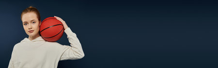 A young woman poses with a basketball against a vibrant blue backdrop.