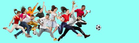 Beautiful male and female portrait on blue backgroud. Smiling, surprised, screaming. Human emotions, facial expression, sport fans. Creative collage made of different photos of 9 models.
