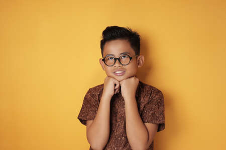 Portrait of young Asian boy wearing glasses and batik shirt looking up and thinking, against yellow background