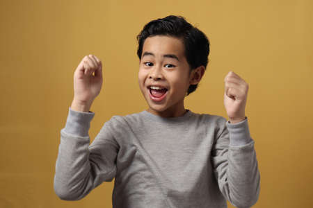 Portrait of cute smart young Asian boy wearing grey shirt shows winning gesture and smiling at camera, celebrating success victory against yellow background