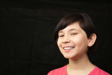 Portrait of a little smiling girl in a pink t-shirt on a black isolated background.