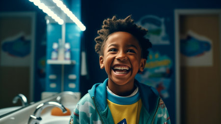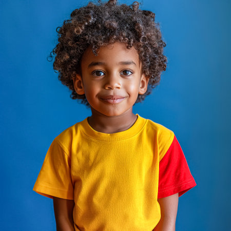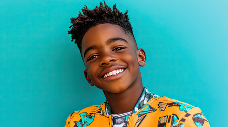 A joyful young boy smiles brightly against a vibrant background, showcasing happiness and confidence. His colorful outfit adds to the cheerful atmosphere, symbolizing youth and playfulness.