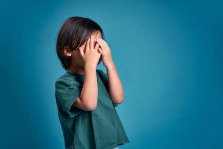 Happy asian little kid blocking face with both hand. Empty space in studio shot isolated on colorful blue background. Education concept for school.