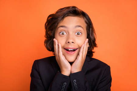 Photo of amazed young shocked boy hold hands cheekbones information isolated on orange color background