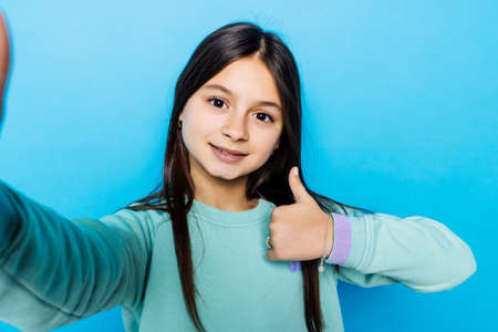 Portrait of happy friendly little girl over blue background taking selfie with thumbs up