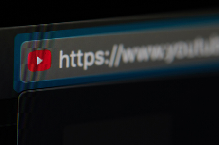 Ufa, Russia. February 15, 2019: Youtube word in search bar on the monitor screen close up