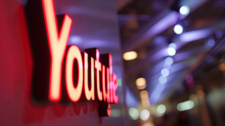Volumetric red YouTube inscription hanging on the wall glows indoors