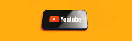 Kharkov, Ukraine - March 24, 2021: banner with Youtube app logo on the screen, copy space