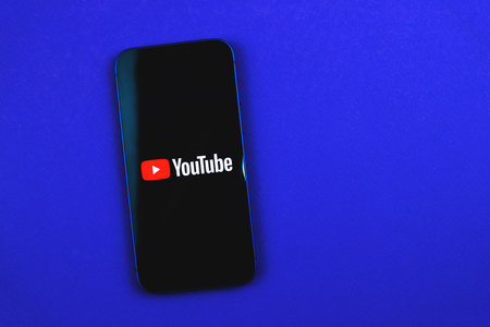Kharkov, Ukraine - March 24, 2021: Man holds mobile phone with Youtube logo