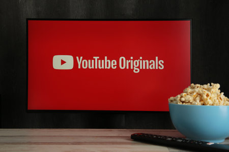Nikolaev, Ukraine - November 20, 2021. Youtube logo and application on TV. YouTube is video-sharing website. Top view