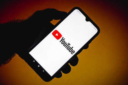Wroclaw, Poland - JUN 17, 2021: Man holding device with YouTube logo on screen. YouTube is most popular video service developed by Google.