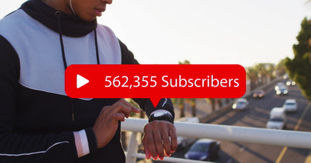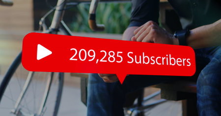Image of digital interface Subscribers text with growing numbers on red speech bubble over man using smartphone. Global social media network digitally generated image.