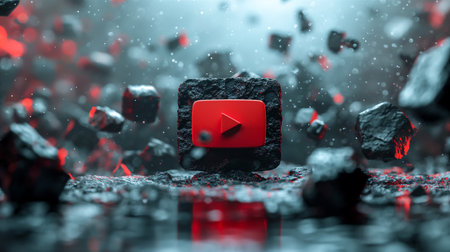 A vibrant depiction of the YouTube logo surrounded by a surreal, abstract landscape filled with floating red and black cubes. Concept background. Generative AI