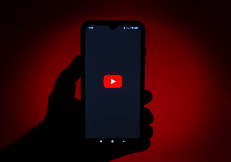 Kharkov, Ukraine - March 24, 2021: Man holds mobile phone with Youtube logo