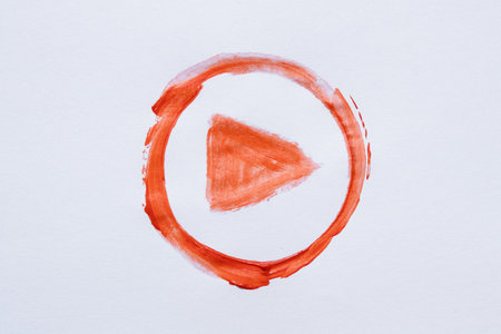 Hand drawn orange play button symbol in circle painted with brush on white background
