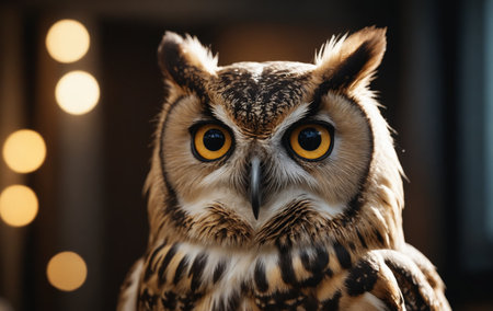 A remarkable close-up capture of an owl, its gaze focused, while blurry bokeh lights dot the backdrop.