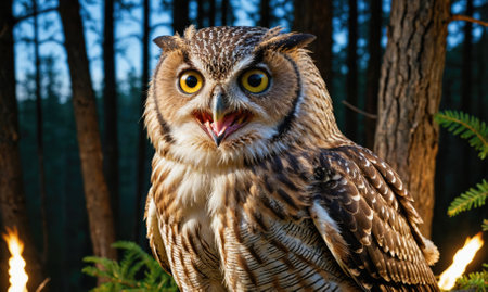 Owl at dusk in forest, wild bird of prey close-up looking at camera in nature.