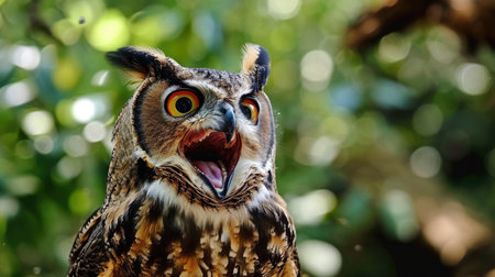 Owl with wings spread, intense gaze, bright background