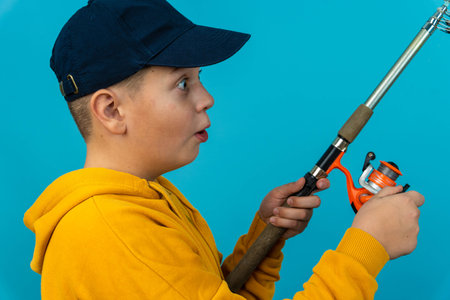 Young boy wearing a yellow hoodie and blue cap is surprised while holding a fishing rod with a reel against a bright blue background during a fishing activity