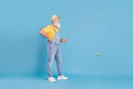 Full size profile side photo of aged man fishing hold spinning rod look empty space isolated over blue color background
