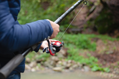 Closeup of fisherman`s hand holding rod with spinning. Fishing reel visible. Selective focus