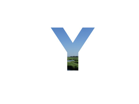 letter Y of the alphabet made with landscape with grass, stream and a blue sky