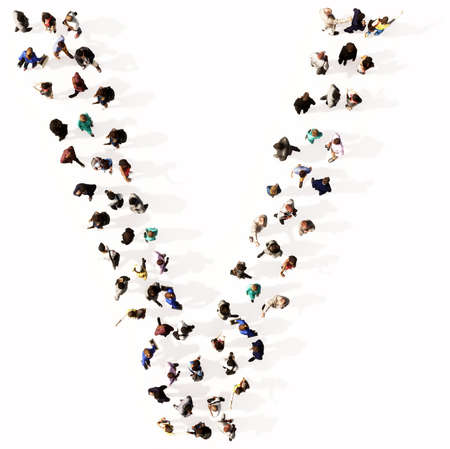 Concept or conceptual large community of people forming the font V. 3d illustration metaphor for unity and diversity, humanitarian, teamwork, cooperation, education, friendship and community