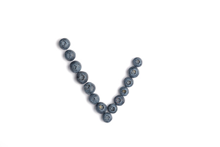 Yes tick sign symbol mark made of Ripe bilberry or blueberry over isolated white background
