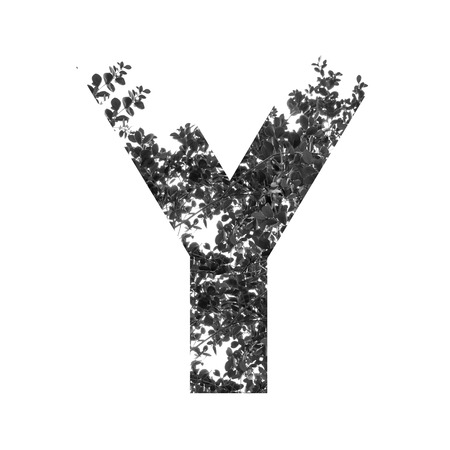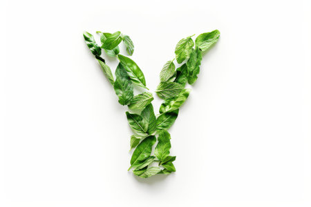 A close-up image showcasing the letter Y formed by a collection of vibrant green leaves, delicately arranged against a stark white backdrop. The leaves, possibly from a mint plant, create a natural and organic interpretation of the letter, emphasizing the beauty and versatility of nature.